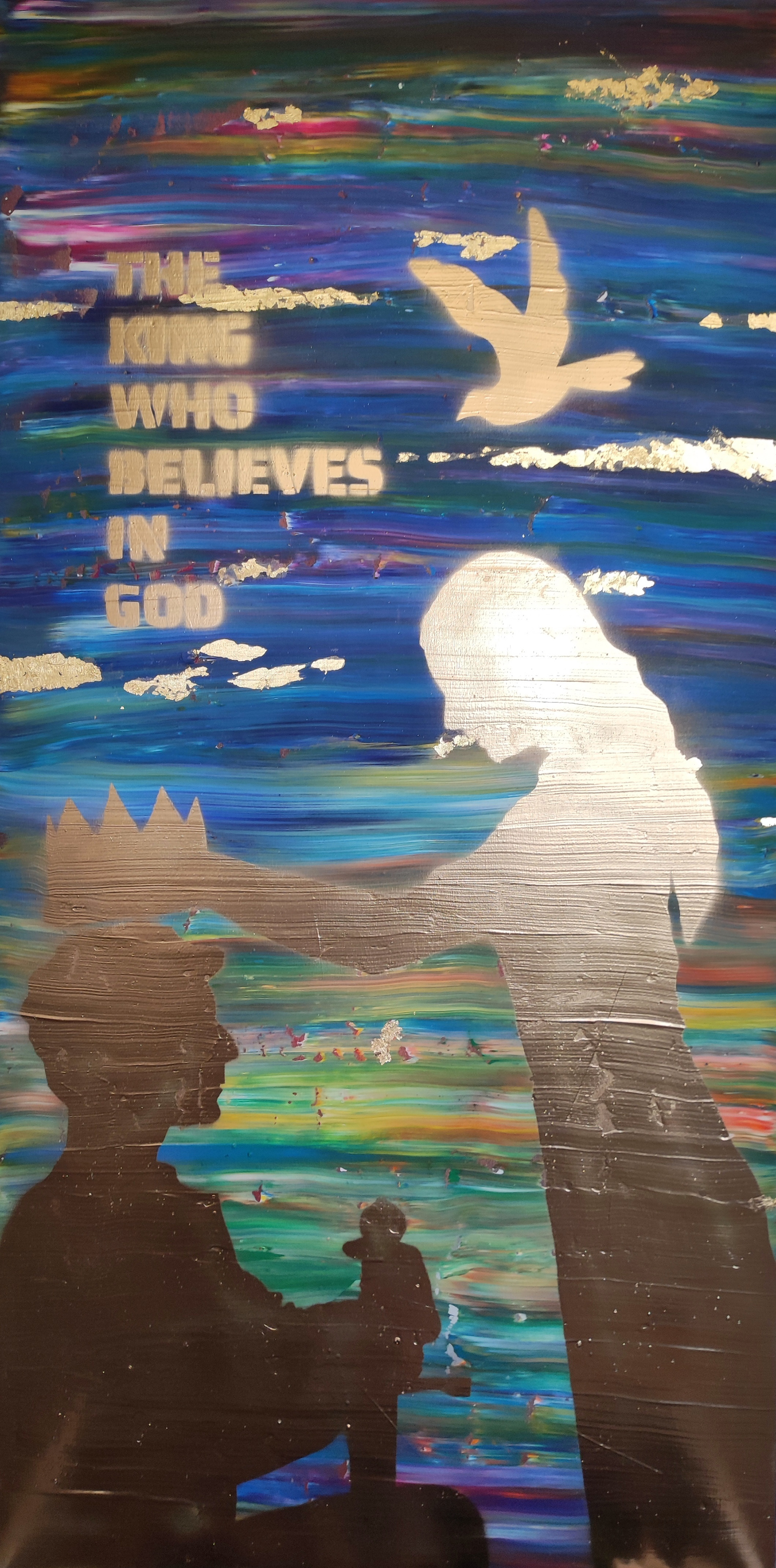 Title: King 220705 - The King Who Believes in God // Artist: Markus Anderschitz // Year: 2022 // Size (cm): 70 x 120 x 2 cm // Material: Wood // Medium: Acrylic, Spray Paint, Mixed Media