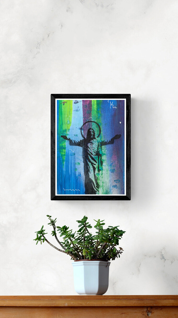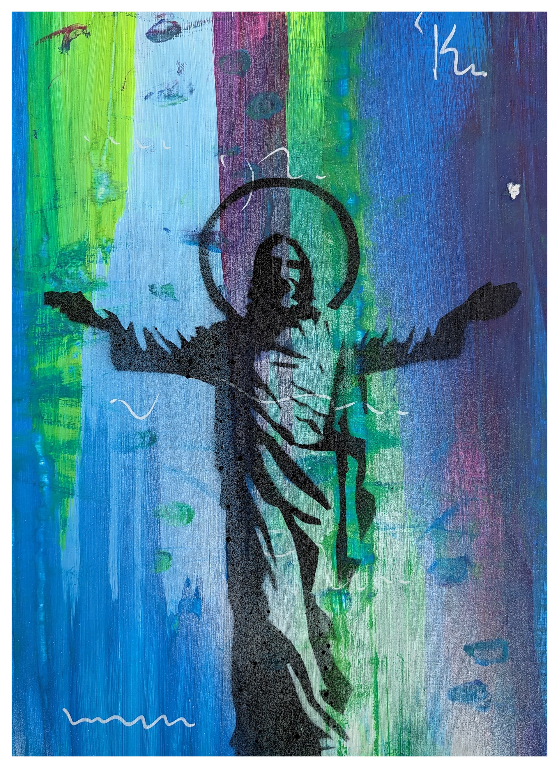 Title: Jesus 230830 - #2 - The Blessing 1 // Artist: Markus Anderschitz // Year: 2023 // Size (cm): 30 x 40 x 0,2 cm // Material: Paper // Medium: Acrylic, Spray Paint, Mixed Media